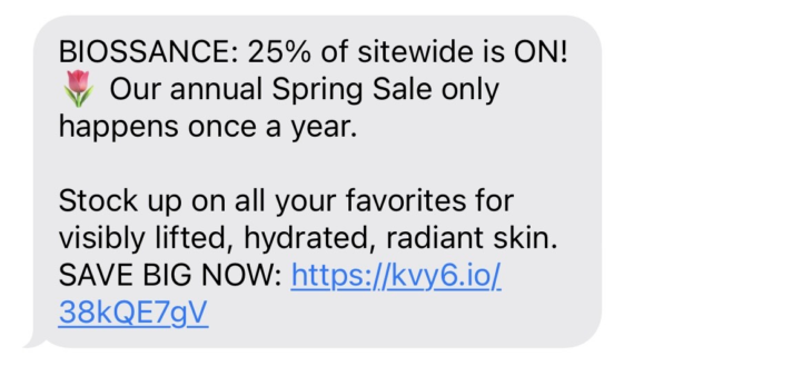 Brands usually have to experiment to find what works best. Let’s explore an example from Biossance.They shared a text, sent an email, and updated their homepage with similar messaging.